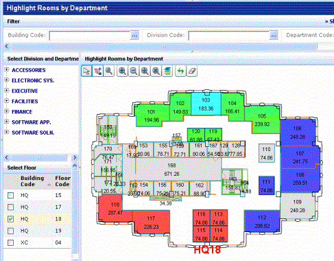 Similarly, you can define highlight patterns for room categories, room types, room standards, group standards, employee standards,and leases, and then highlight rooms,groups, and suites according to these assignments. Queries such as these enable you to visually see the properties of the rooms, groups or suites of a particular floor. Highlighted entities appear on (Flash drawings) or in paginated reports.