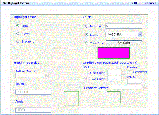You can choose various types of highlight patterns: solid color fills, black and white , and color hatch patterns. You can also choose gradient patterns for paginated reports.