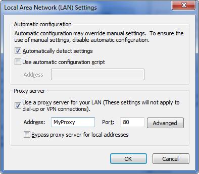 For most networks in which Web Proxy Autodiscovery (WPAD) has been established, the automatically detect settings option will find the proxy server configuration with no other adjustment. Otherwise, you can enter the proxy server settings in the Connections / LAN Connections dialog of the Tools / Internet options command shown below.