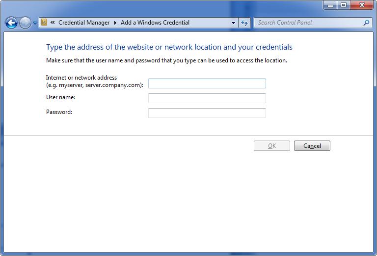 In the Credential Manager, choose Add Windows Credentials, and then enter the address of your proxy server and the username and password it requires: