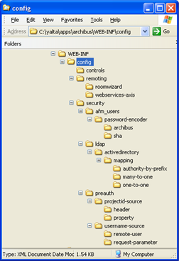 Web Central becomes a set of “Plain Old Java Objects” (POJOs), glued together by the Spring container according to the configuration settings, specified in the configuration files. During the deployment you can combine provided POJOs (or add your own) in many different ways, just by changing the configuration files. Since so many configurations are possible now, ARCHIBUS ships configuration files for several of the most common scenarios. The configuration files are organized in folders in the /WEB-INF/config folder: