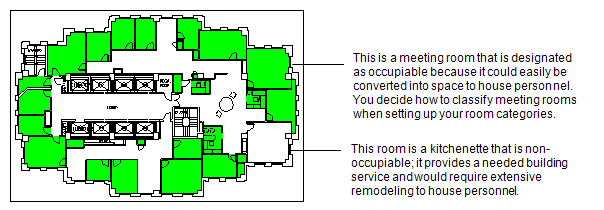 For example, a carpeted meeting room might easily be converted to office space simply by installing cubicles. You could classify this meeting space as non-occupiable service area to indicate that it is currently not housing personnel, or as service area that is occupiable to indicate its potential to be an occupiable room. Classifying the room as service area that is occupiable enables you to track service area that could be reclaimed to house personnel if needed. Classifying the room as service area that is non-occupiable documents the room's current use.