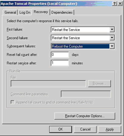 The service manager also gives you the option of having Tomcat restart the application server (and there by restart ARCHIBUS Web Central) or even restart the computer should it encounter an error.