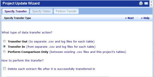 When performing a Transfer In, you need to specify if the extract files should be deleted after a successful transfer into the database. Deleting the files after that transfer is useful if you are running the wizard multiple times and want to re-run the wizard on just those tables that failed to import in the previous pass. By default, the files will not be deleted.