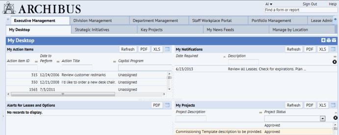 El Panel de control aparece en la parte superior de la ventana de la aplicación ARCHIBUS Web Central y ofrece al usuario un sistema de pestañas de dos niveles para organizar las vistas de ARCHIBUS a las que más accede y, opcionalmente, a sus datos personales. Por ejemplo, la pestaña Ejecutivo (nivel superior) puede presentar una serie de pestañas (segundo nivel) para acceder a las tareas e informes ejecutivos de resumen más consultados en todas las aplicaciones de ARCHIBUS. Una pestaña de segundo nivel también puede mostrar una pantalla que presente varias vistas a la vez, lo cual se conoce como vista de panel de control.
