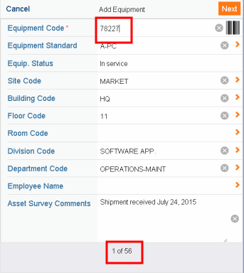Complete Equipment Code either by typing a value or scanning the bar code on the item. Complete other fields as desired, and choose Next to process this record and enter the information for the next record.