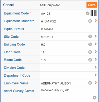 | Bar Code Scanning | moves you to the Add Equipment form. Complete Equipment Code by typing a value or scanning the bar code of the physical item. When through with the form, tap Next to process the record and enter the next value. When you have completed all records, tap Done and the system displays the new records in the Asset Inventory List form. |