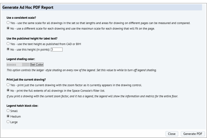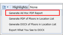 If you want to print using standard settings, you can select a Highlight, Label, and Border from the lists at the top of the Space Console and not make any further adjustments. However, after selecting a highlight and label, you can also make adjustments to the drawing by selecting background layers (for example to include layer elements, such as leader lines.) To set print options (such as label height), select Generate Ad Hoc PDF Report from the Export options.