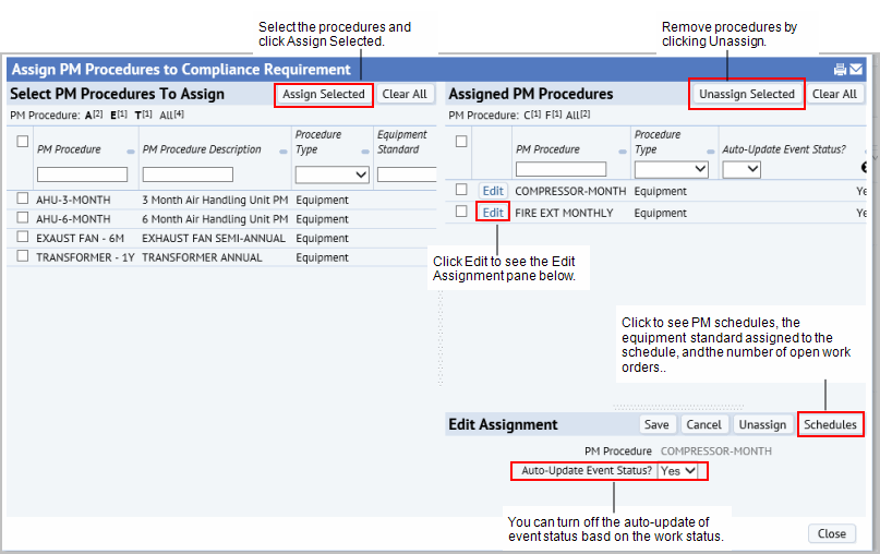 Tip: You can assign multiple PM procedures to an event. By doing so, a single compliance event can track the status of multiple work requests for multiple preventive maintenance procedures.