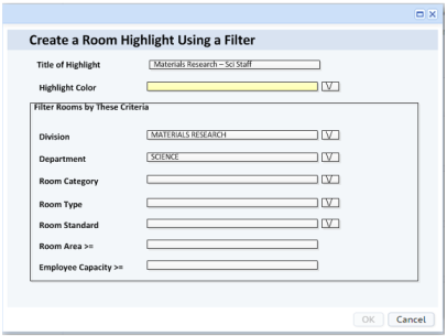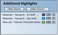 For example, you may need to highlight all rooms of a particular standard that are larger than a particular size because these rooms are not adhering to the standard definition and need to be examined. Choose Filter Rooms and use the resulting form to define this restriction, assign a title, and specify a highlight color. The restriction title and highlight color will now appear in the "Restriction Highlights" form.