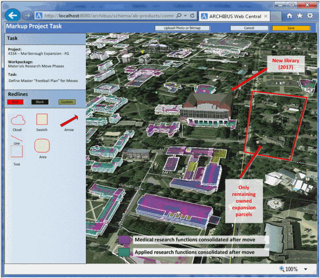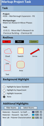Space planners and project managers may want to mark up floor plans and images to show proposed changes, notations, and highlights and then share these mark-ups with others in the organization. Markup drawings are associated with action items, which are part of a project's work packages. When working with the Space & Portfolio Planning Console, if your scenario is linked to a project, you can add markups to your plans and image.