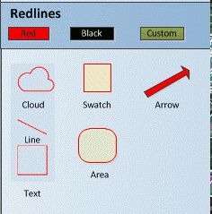 Drag and drop the redline controls from the palette to the desired area of the drawing. If you wish to use a color other than the default red, you can select Black or a custom color. All future redlines will use this color until you change the color again or exit. If you set a custom color, the panel will display the Custom button in this color.