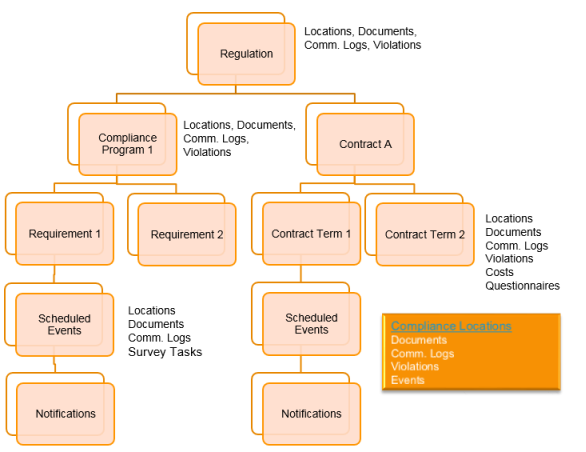 At the next level, contracts have specific contract terms, and compliance programs have specific requirements; these are both stored in the Requirements (regrequirement) table. Events and corresponding notifications can be generated for contract terms and requirements.