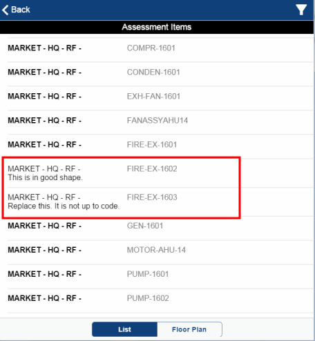 El evaluador de campo tal vez quiera ver los elementos de evaluación en un dibujo de plano de planta en vez de en una lista. En tal caso, el evaluador de campo toca el botón Planos de planta, recibe una lista de plantas con elementos de evaluación y escoge un plano de planta. El sistema presenta el plano de planta y: