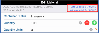 The system uses the system date to complete the Date Last Inventoried field of each instance of a material that you verify. In addition, if you make edits to a materials record, the system updates the item's Date Last Updated field. The Edit Material form reminds you of these dates in the upper right corner.