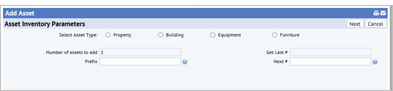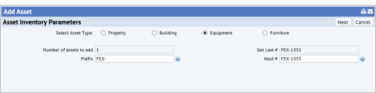 When you select a prefix, the system fills in the Next # field for you. If you are adding multiple assets, the system creates a record for each asset using the sequential numbers.