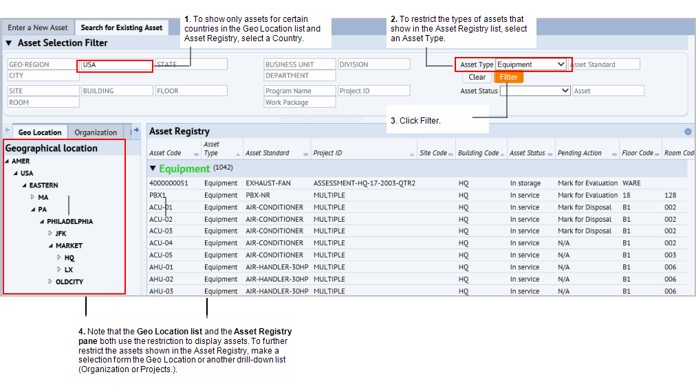 The Asset Registration Console includes the Asset Selection Filter and the Geo Location, Location, Organization, and Project drill-down lists. The restrictions you set in the Asset Selection Filter affect what shows in the drill-down lists and in the Asset Registry pane. The drill-down lists that the restriction is applied to depends on the type of criteria you enter. For example, if you enter a building as criteria, the Geo Location list is restricted, but not the other lists.
