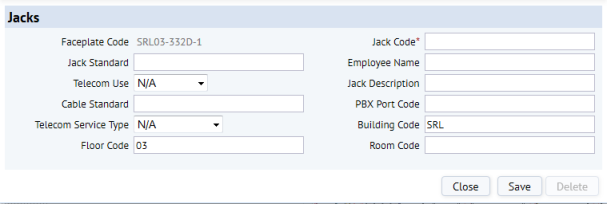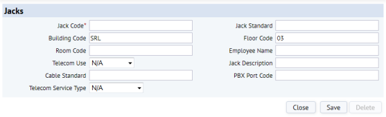 | Jack Code | Enter a unique code to identify the new jack in the telecom inventory. Recommended: assign a code that locates the jack by building, floor, and room, with a D or V suffix to indicate whether it is a voice or data jack. For example: HQ-17-101-D, or HQ-17-101-V. |