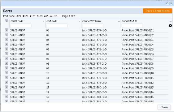 The trace feature visually shows you the connections; it does not show the exact ports on equipment or patch panels or jacks on faceplates to which an item is connected. To see this level of information, you must list the telecom connections.