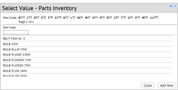 When you manually adjust the parts inventory, you select the part you are making adjustments for. If the Part Code does not yet exist in the database, you can add it by clicking on the “Add New” button on the Select Value form accessed by clicking in the Part Code field.