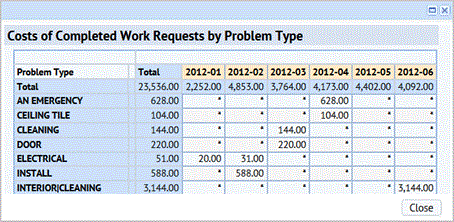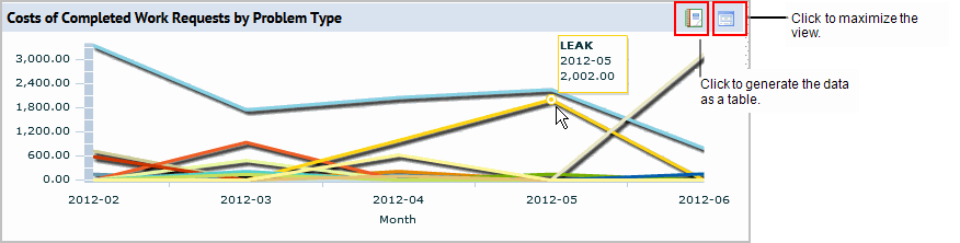 Select the Cost Details tab to see the Costs of Completed Work Requests by Problem Type. This report shows a line graph with a line for each problem type for the selected year. Mouse over a line and a tool tip shows you the problem type and summarized cost for that point in the time line. Click the Maximize button to open the line graph in a larger window. This report helps you analyze the primary drivers of maintenance costs.