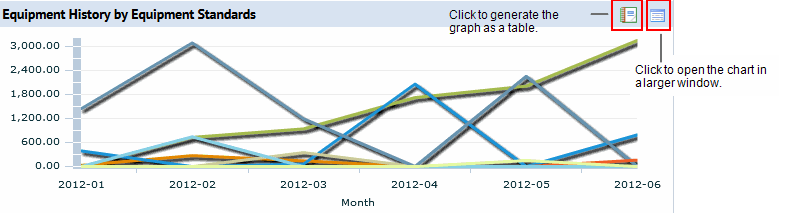 Select the Cost Details tab to see the Equipment History by Equipment Standard report. This report is a line chart showing the cost of completed work for the selected year by the type of equipment (its standard). Mouse over a section of the line and a tool tip shows the equipment standard and its cost for that point in the time line. Click the Report button