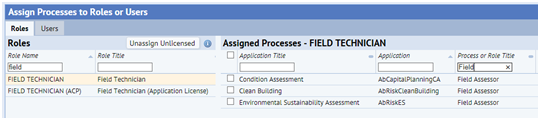 The Assessment activities contain forms that enable assessment managers to assign work to individual field technicians using the Assessed By field. In order to have field technicians show up in this list of assessors, assign one of the "Field Assessor" processes to that field technician's role.