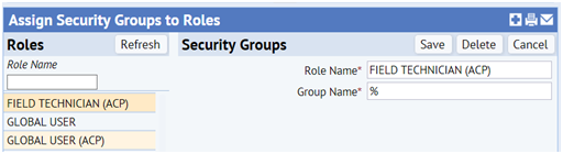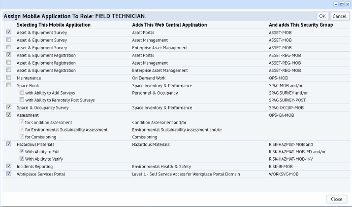 Note: If you are accustomed to assigning Web Central security groups to users using the "%" methodology, such as assigning all Space security groups using SPAC%, note that mobile does not use this approach. If a mobile app offers multiple security groups, you must explicitly assign each security group to a role. Using a wildcard grants the user the group security permissions allowed by that wildcard, but does not assign mobile apps. The Space Book and Hazardous Materials mobile apps have multiple security groups; see below additional notes for these security groups.