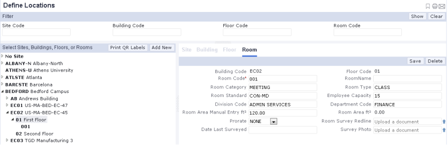 ARCHIBUS applications that require a room inventory typically provide a task with a tree view in which you drill down through sites, buildings, and floors so that you can develop a room for the selected location, or view room details for the selected location.
