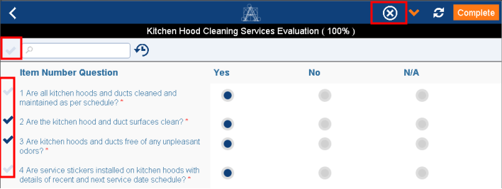 If the inspector has already completed the survey and has not yet synced, the event will appear as Completed (green) in the event list. Tap the event, and the app opens the questionnaire with the responses so that the inspector can change them as needed. When the inspector completes the corrections, they tap Complete again to reset the status to Completed.