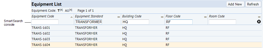 In some data entry grids, filter forms, and hierarchy trees, the system may presents the Smart Search console at the top of the form so that you can restrict the values that the form presents. Complete the Smart Search console with a value and the resulting form will display records restricted to that value. For example, in the below image, the user has completed the Equipment Standard field to restrict the list of equipment in the grid to just those that have an Equipment Standard of TRANSFORMER. For tables that contain a lot of records, use the Smart Search console to locate just those records that you need.