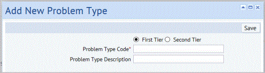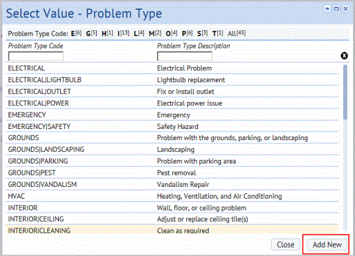The Select Value - Problem Type form appears. Problems are reported in two levels, a broad category and then a specific type within that category. This helps to easily locate related problems, and to clearly define the problem. This form lists all problems already defined.