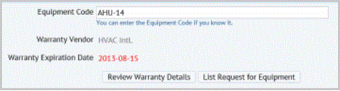 When you select equipment, if the equipment has warranty information entered for it, the warranty vendor and expiration date appear on the screen. You can click Review Warranty Details to see more information, including contact information if it has been entered. If you click List Request for Equipment, a form appears listing any open requests for work for this piece of equipment.