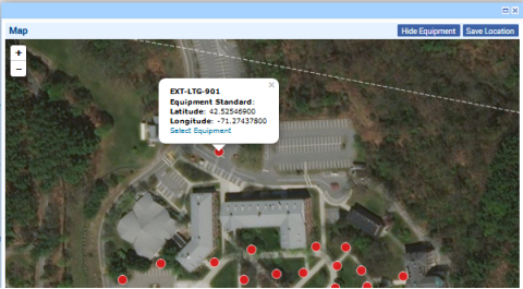 You may know the location of the equipment, but not the exact equipment code. In this case, you can enter the site or building in which the equipment is located, and click the Map button. On the map, choose Show Equipment, and the map presents markers for each equipment item in the building or site. Click on a marker to see equipment details, and choose Select Equipment in the details pop-up to select an equipment marker. The system closes the map and completes the Equipment Code with the selected marker.