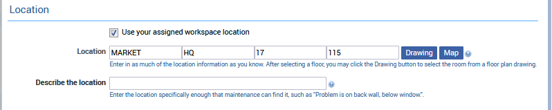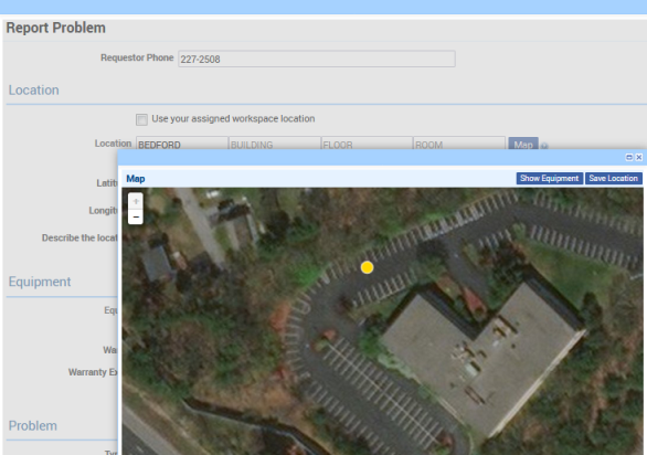 If you did not enter a location for the problem in step 3, when you select an equipment item, the system will update the location fields with equipment item's location or the equipment item's longitude and latitude.