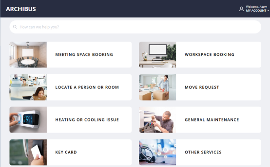 Facility managers supply this view of Workplace to users by providing a URL in the format: https://<server>/archibus/workplace?action=servicecatalog.