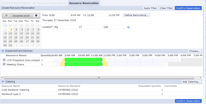 As with all reservations, if you do not enter a From and To time in the Filter, the application shows all resources matching the criteria you enter, and shows the existing confirmed reservations for the resource. This enables you to assess what is the best time to set up your recurring reservation based on the available time slots.