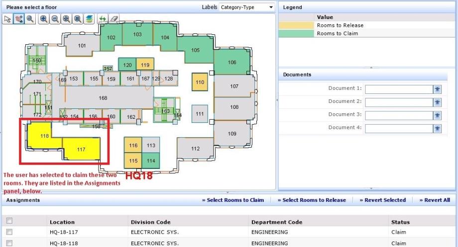 The system moves you to the Assignments tab so that you can specify the rooms to claim and release. Note that when you choose a room to claim or release, 100 percent of the space in that room is assigned or released from you.