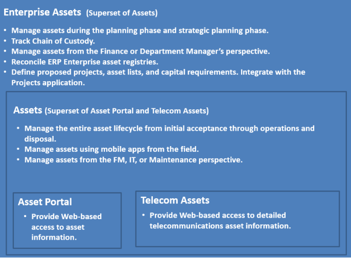 Assets is, in turn, a super-set of the Asset Portal application and the Telecom Assets application. If a customer has Assets, they do not need Asset Portal or Telecom Assets.