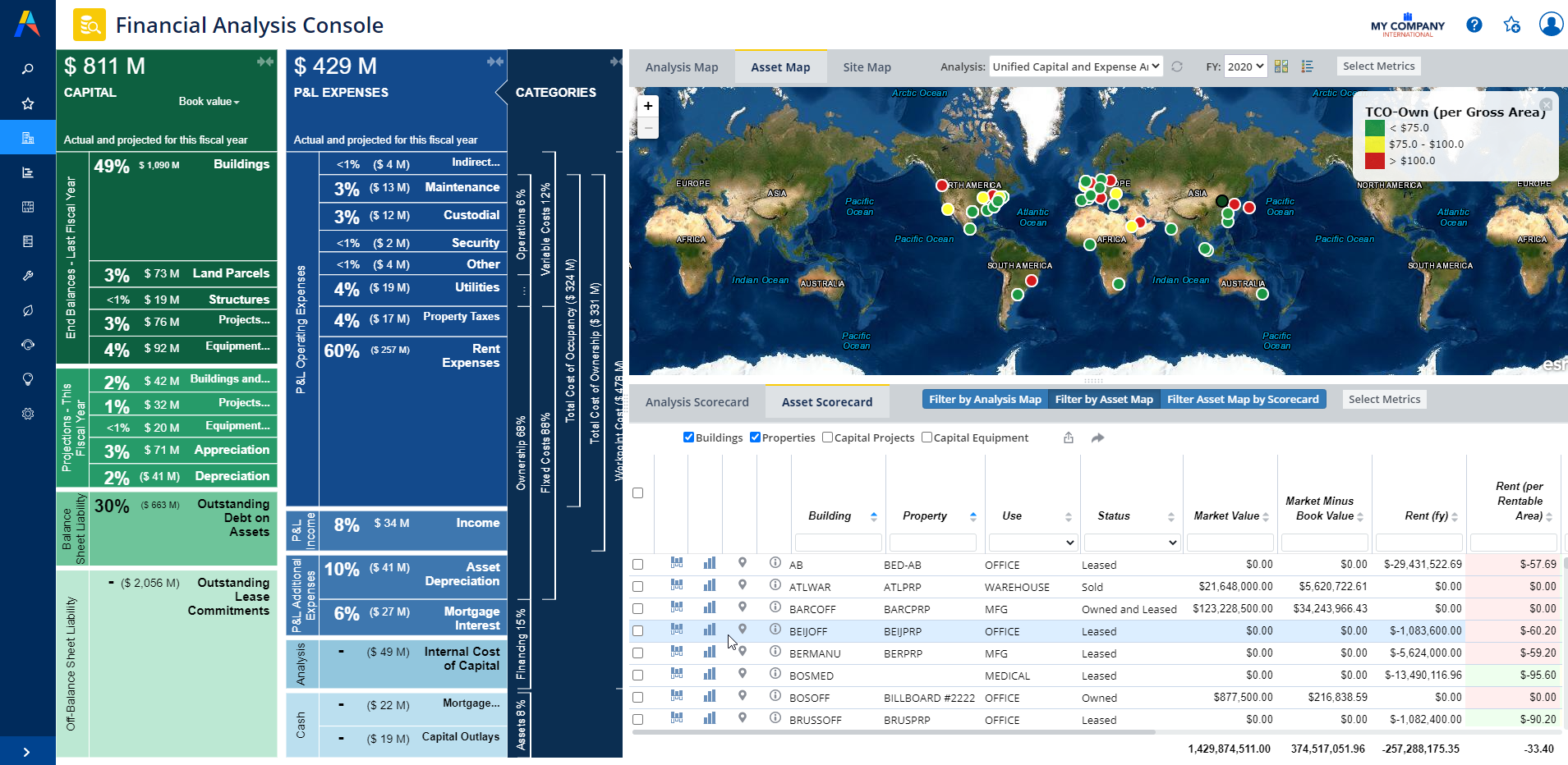 Summarize operational and capital expenses for buildings and business units Estimate the total cost of occupancy – that is all real estate, infrastructure and facility expenses Estimate the total cost of ownership – that is all expenses plus all depreciation of multi-year investments Estimate the workpoint cost – that is the total cost of ownership plus the cost of financing and opportunity Calculate metrics that scale the costs per seat and per sqft or sqM Benchmark yearly costs against organizational targets to find outliers Benchmark lifecycle costs and benefits of a facility to compare cost/benefit of different building and capital project investments Compare these metrics and benchmarks against measures of the performance of the real estate and infrastructure, including FCI, vacancy, and mission criticality Locate these metrics and costs geographically, and include them in the same view as the capital invested in building, structures, land and equipment assets Coordinate the financial point of view of different stakeholders, as they come to the unified picture of finances from a real estate, capital, operations or financing perspective |