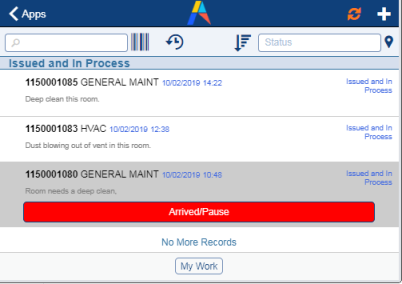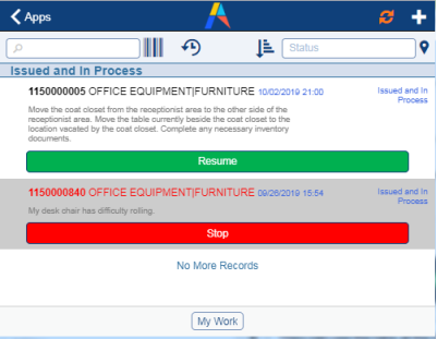 | Issued | To process work that is issued. This tab shows work assigned to the craftsperson that has a status of "Issued and in Process." The craftsperson can process work from either this tab or from the My Work tab. |