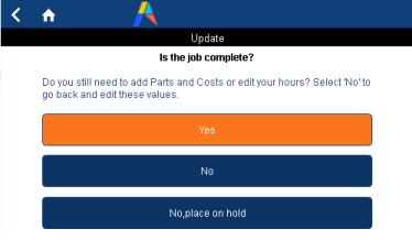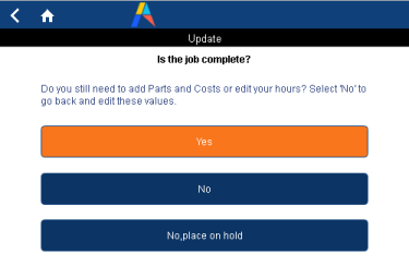 As another option, they can stop the timer. This action prompts them if they want to complete the job, or add more details. If they choose Yes (they want to complete the job), they are prompted to enter a comment and then sync, which updates the status and removes the job from the work list.