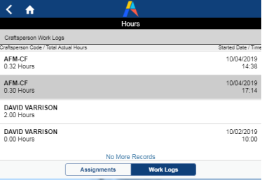 Although the timer records the minutes spent on a job, the craftsperson may need to edit this information or add additional hours. Using the Hours button, the craftsperson can access the work logs for all craftspersons who worked on the job; however, a craftsperson can edit only their own work logs.