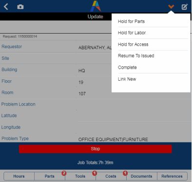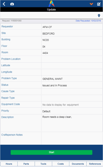 While addressing a job or reporting a new one, craftspersons may want to document the damage by taking a picture of the affected area or marking the damaged area on a floor plan. From the Update Work Request screen, the craftsperson can do the following: