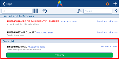 Additionally, the craftsperson can cancel the hold status when work can resume on the job. To do so, the craftsperson chooses the "Resume to Issued" option to reset the work's status to "Issued and in Process."