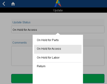 You are prompted to enter a comment and the type of hold. Clicking the green Update Status button stops the timer and returns you to the work list where you can sync and update the server with the s On Hold status you selected.