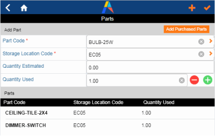 As they use parts to address this issue, craftspersons can tap the Parts button to move to the Parts screen. Depending on practices at the site, the maintenance manager may have already estimated the parts required for the job. With this button, the craftsperson can enter the quantity actually used or add new parts to the job. As they add parts, the form lists the parts at the bottom of the screen.