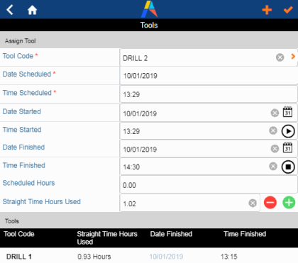 Like parts, the maintenance manager may have already estimated the tools (such as saws, drills, ladders, fans, fork lists) required for the job. If so, the craftsperson can enter the amount of time the tools were actually used. If no tools have been specified, the craftsperson can add the tools that they used. Documenting the tools used on a job is important for tracking the overall use of a tool so that the maintenance manager can plan for maintenance and service on the tool. Like parts, tools that the craftsperson adds are listed at the bottom of the screen.