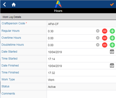 In order to enter Regular Hours, the Craftsperson must have a Work Log to edit. Therefore, if they prefer to not use the timer but simply edit Regular Hours, they must minimally start the timer to generate a Work Log record to edit. They can then enter Regular Hours.