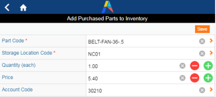 If craftspersons need to purchase a part in order to complete the job, they can Use the Add Purchased Parts button to enter the part into inventory. When you complete the work request, the system debits the inventory of the parts used; therefore, it is important to enter any parts purchased during a job.